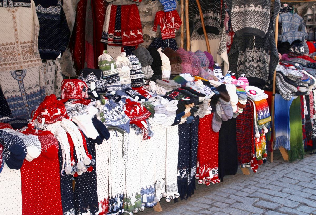 Knitted woolen clothes in a market