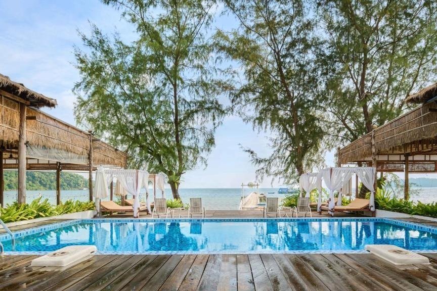 Located on Koh Rong Samloem in southern Cambodia, Eden Beach Resort by EHM sits along the sands of Saracen Bay. The resort is accessed by a 45–60 minute boat transfer from Sihanoukville, with Sihanoukville International Airport located around 22 km away. This 4-star beachfront property offers modern rooms with air conditioning, free Wi-Fi, private bathrooms and outdoor seating areas. Facilities include an infinity swimming pool overlooking the sea, spa and wellness centre, beachfront restaurant serving international and local cuisine, and an open-air bar with bay views. Guests also have direct beach access with sun loungers and service on the sand. Its setting provides a relaxed base for swimming, snorkelling and exploring the island.