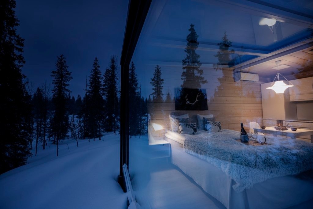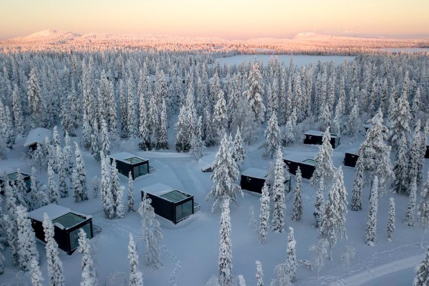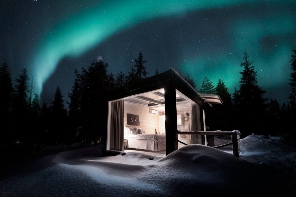 Located along the serene shores of Lake Rukajärvi in northern Finland, Iisakki Glass Village provides an unforgettable experience in stylish glass villas. The villas feature floor-to-ceiling windows and glass roofs, allowing visitors to admire the Northern Lights from the comfort of their beds. Each villa comes equipped with a kitchenette and a modern bathroom, and breakfast is included with the stay. Guests have the option to dine at nearby restaurants and, during the winter, can book a private sauna experience, all set against the backdrop of pristine Arctic wilderness.