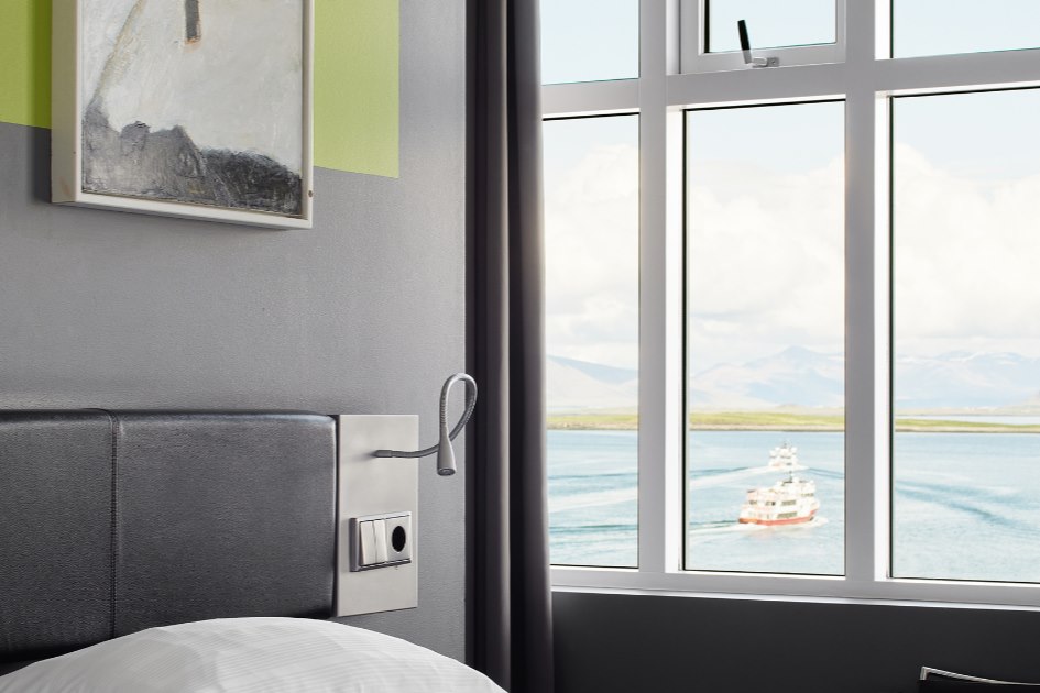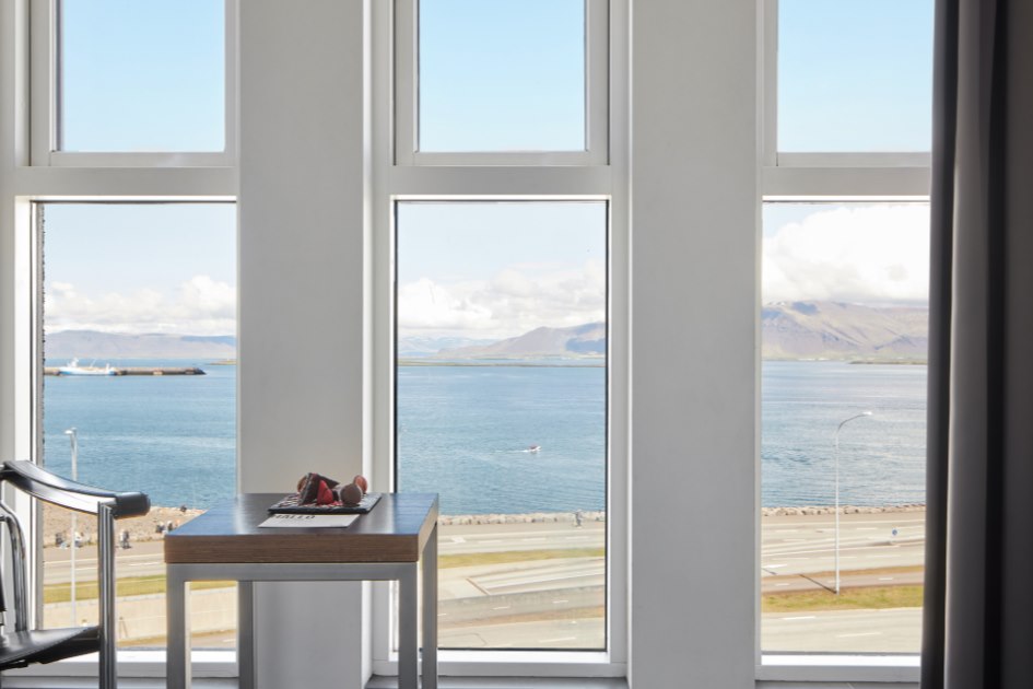 The hotel features 104 modern, Scandi-inspired guestrooms, each designed with cool greys, chrome accents, and pops of bright colour. Rooms include private bathrooms, flat-screen TVs, free high-speed Wi-Fi, tea and coffee facilities, and minibars. If you're seeking the ultimate Reykjavik experience, you can choose a room with bay or mountain views, or upgrade to enjoy additional space and comfort.