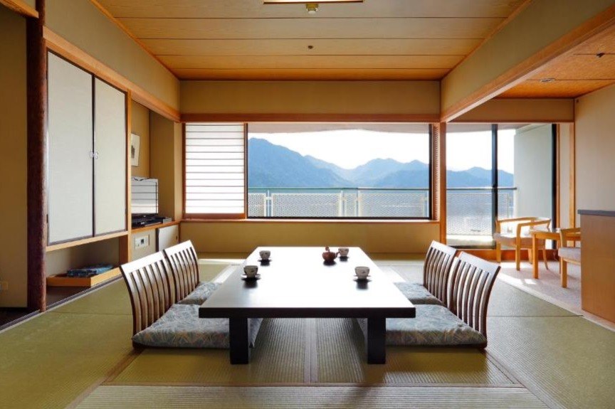 The hotel offers a mix of Western- and Japanese-style rooms, all air-conditioned and equipped with free Wi-Fi, TVs, and private bathrooms, with tatami-mat rooms available for a more traditional stay. Facilities include a public hot spring bath, sauna, seasonal outdoor pool, and the option to reserve a private open-air bath with views towards Itsukushima Shrine. Dining is covered by several on-site restaurants serving Japanese and Italian cuisine made with local ingredients, as well as a lounge bar. Free parking, a 24-hour front desk, and on-site shops add to the hotel’s practical, comfortable appeal.
