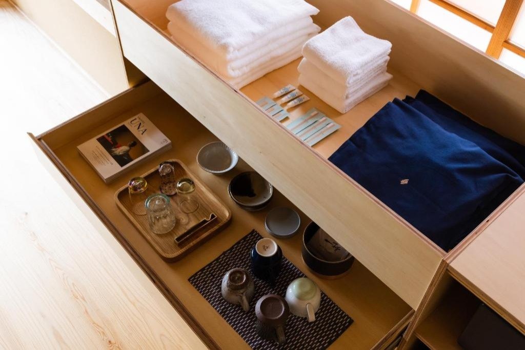 Craft Inn Te is located in the historic Yame Fukushima district of Yame, Fukuoka Prefecture, in the heart of Kyushu’s craft region. Opened in 2021, the inn is a renovated late Edo-period merchant residence once owned by the Tsukamoto family. Surrounded by traditional buildings and artisan workshops, it provides direct access to local crafts, including Kurume kasuri textiles, washi paper, bamboo work, pottery, Buddhist altars, and Yame tea.