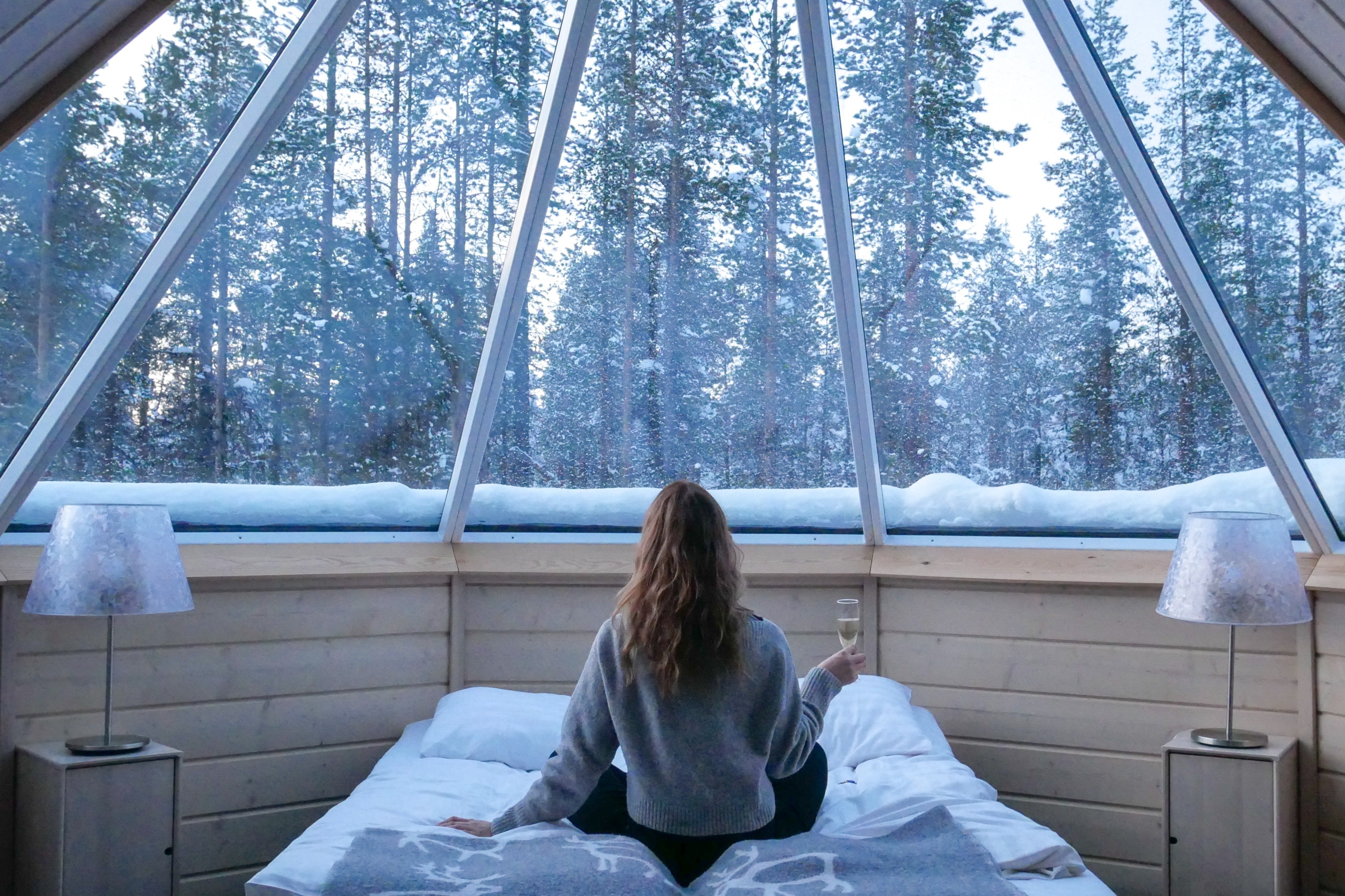 Each Aurora Cabin features a king-sized bed, wooden walls for total privacy and a laser-heated glass roof that allows you to snuggle up and watch the northern lights flickering high above you without having to venture outside.