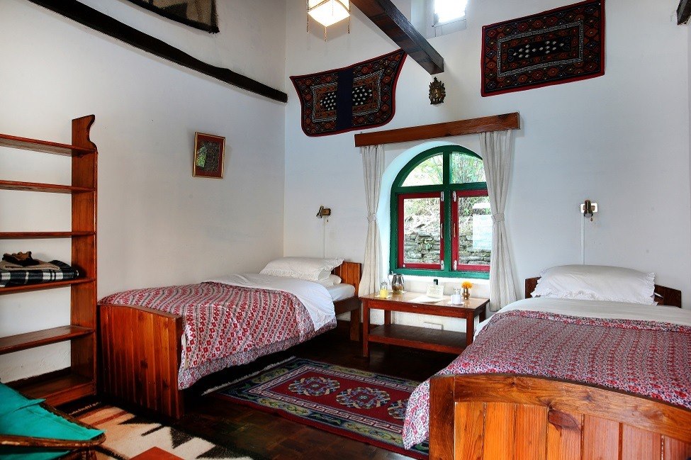 The journey to the lodge is a short drive from Pokhara, followed by a scenic climb, bringing you to an altitude of 4,620 feet. Inside, enjoy spacious, well-decorated rooms with high ceilings and arched windows, each featuring a modern en suite bathroom. As night falls, the cosy main room welcomes you with a crackling fire and a delicious, hearty meal. After dinner, the atmosphere is filled with the sounds of traditional Nepalese music.