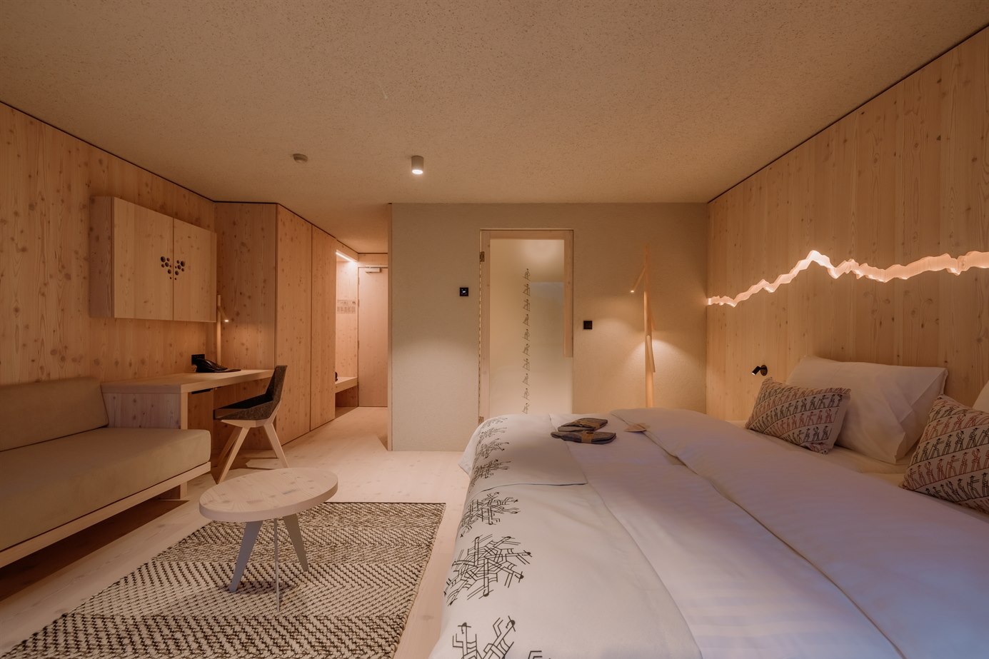 The hotel has 69 rooms, mainly a mixture of Classic and Comfort rooms with many featuring balconies with mountain views and a select few with lake views, all with panoramic windows. The rooms have hardwood floors and walls; in-keeping with its Alpine style and furniture made by local crafts people.