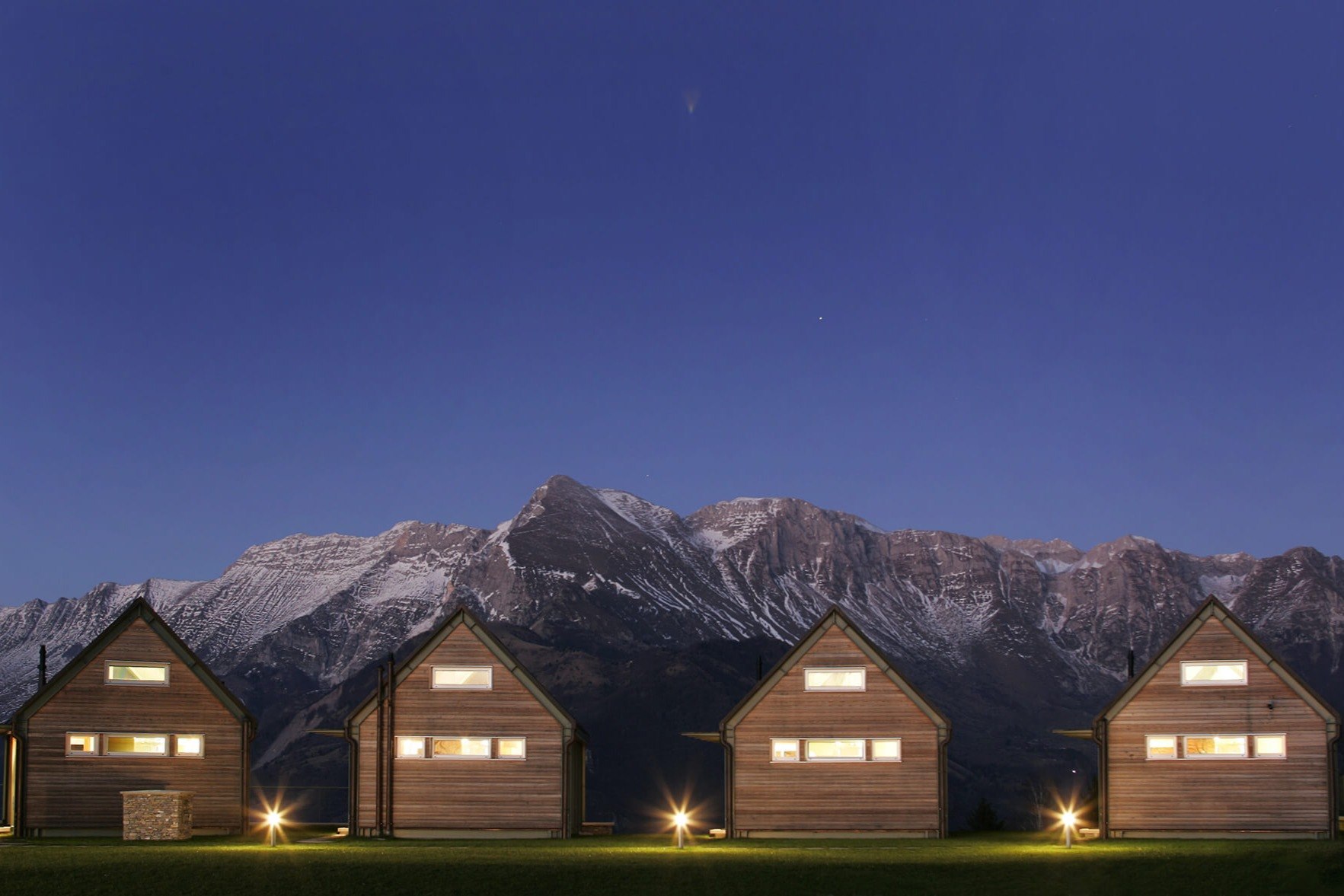 Inside, guests find warm wooden interiors, cosy seating areas, modern kitchenettes and floor-to-ceiling windows that frame the dramatic vistas. Each chalet includes access to the property’s small wellness area, where a Finnish sauna and relaxation room invite guests to unwind after a day of hiking or exploring Kobarid’s dramatic natural surroundings.