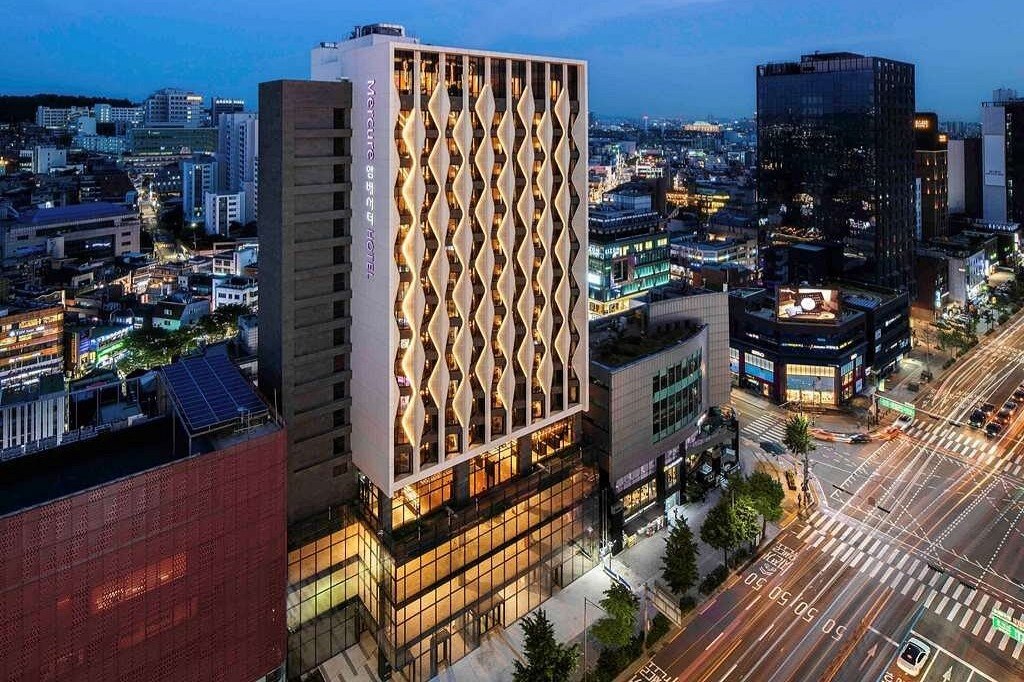 The Mercure Ambassador Seoul Hongdae is located in the vibrant neighbourhood of Hongdae, famous for its urban arts, indie music scene, clubs, and entertainment options. Situated within walking distance of Hongik University Station, guests enjoy easy access to local markets, parks, art galleries, and shopping districts. The hotel features 270 contemporary rooms with flexible furniture, premium bedding, free WiFi, IoT control system, and Chromecast. Additional amenities include a modern restaurant & bar, gym, coin laundry, and 2 meeting rooms.