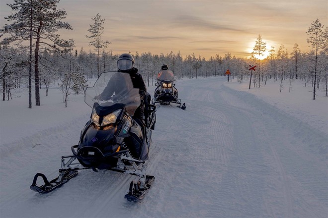 Experience an exhilarating adventure through the breathtaking Lappish wilderness on electric snowmobiles. Your journey begins with a warm welcome from your professional snowmobile guide at your hotel’s reception. From there, transfer by car to an exclusive location deep within the wilderness. Enjoy the stunning views of Arctic nature along the way and take a break midway at a charming wooden hut, where you can savour warm drinks and relax before continuing your adventure. In the evening, enjoy dinner served at the hotel's restaurant. (B,D)