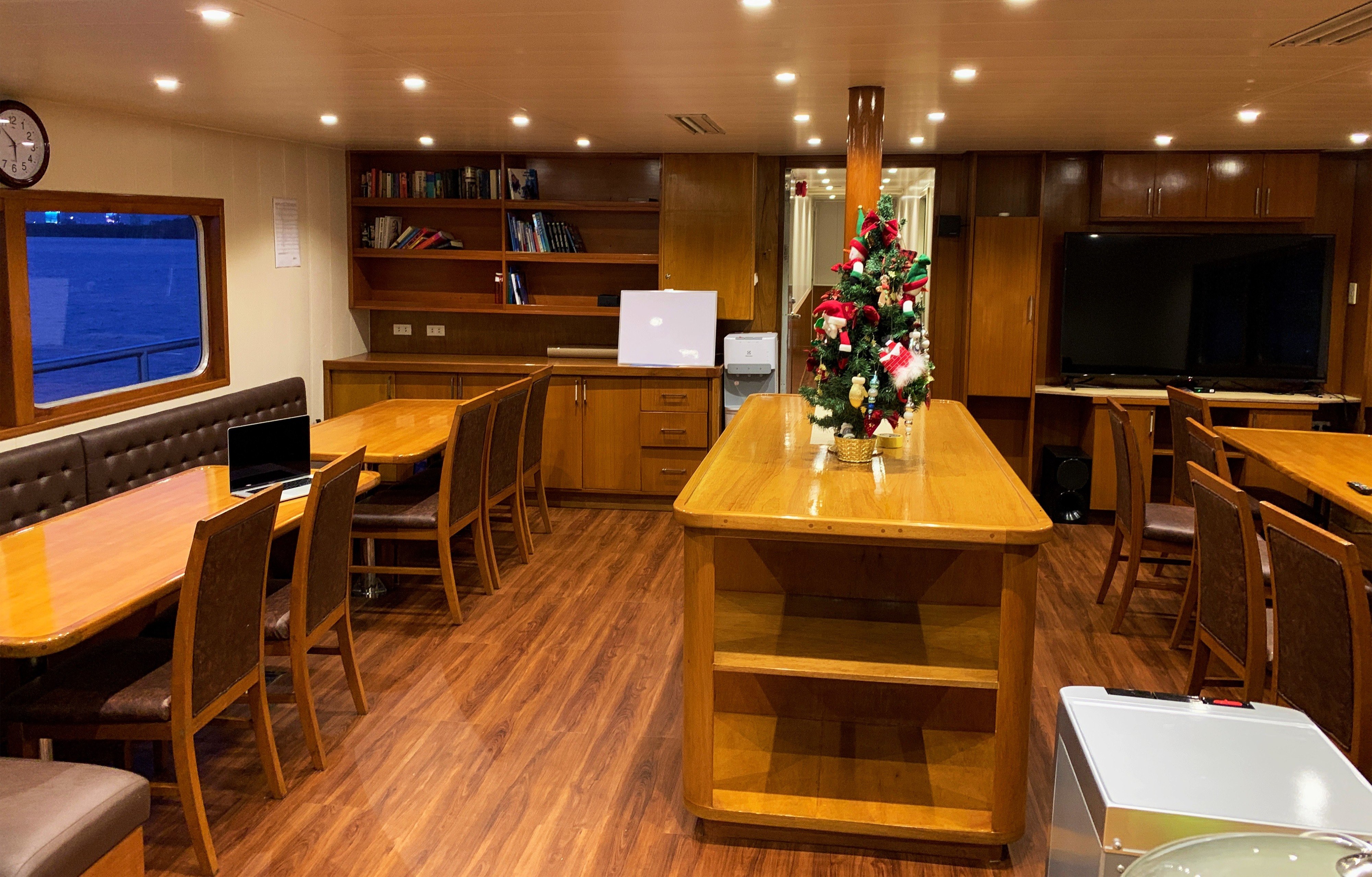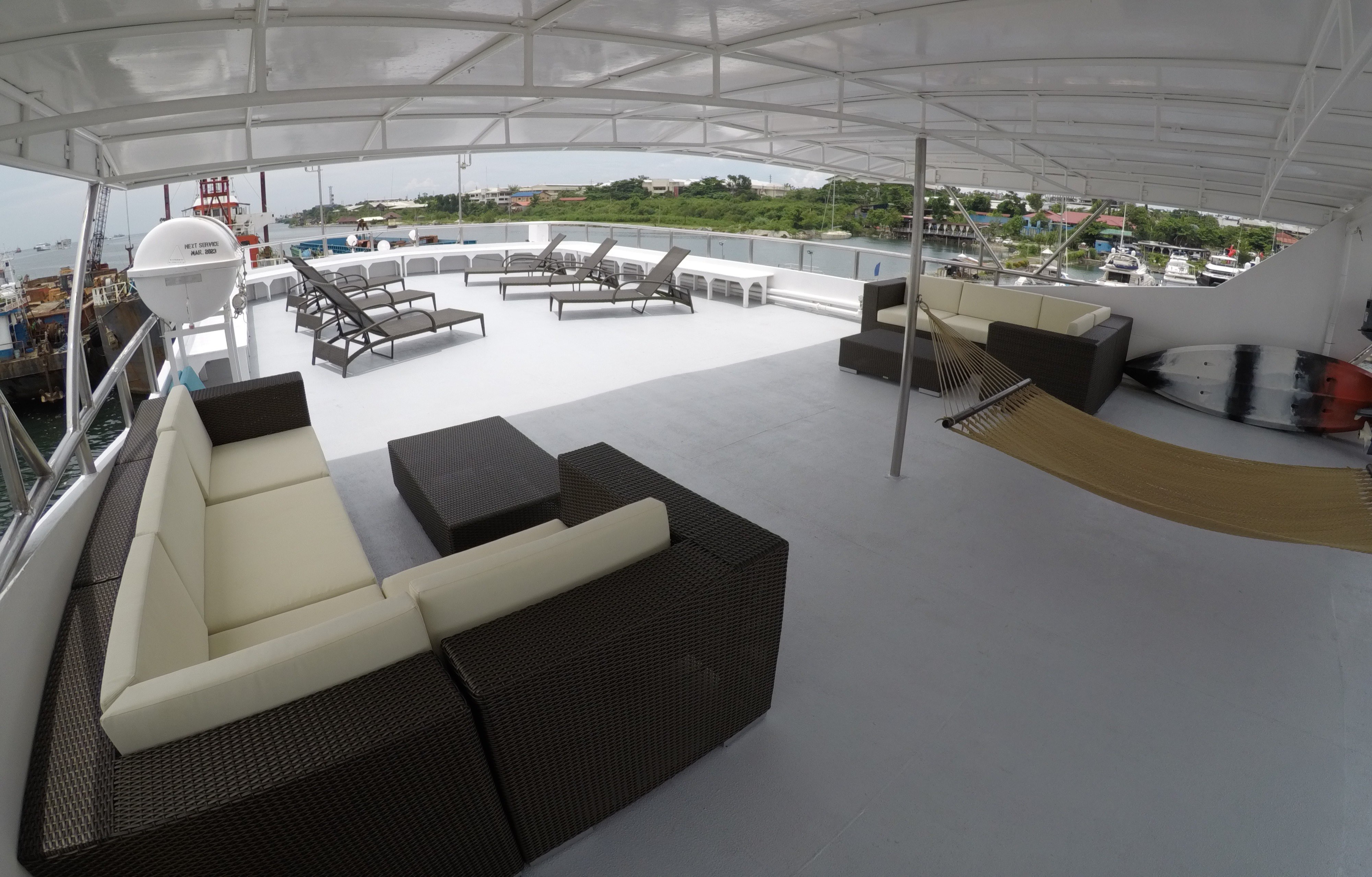 Guest areas include a sun deck with loungers, a lounge with TV and a small library, and several seating areas for relaxing between dives. The yacht is fully equipped for divers, with a spacious dive deck, individual gear storage, camera facilities, hot-water showers and Nitrox available. Zodiac tenders provide access to nearby dive sites.
